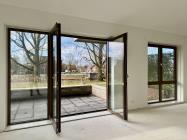 o Royale, lichte woonkamer met openslaande deuren naar terras.
