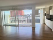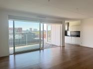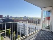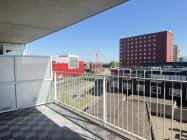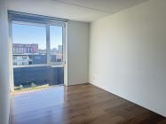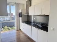 De lichte woonkamer van circa 34 m² beschikt over een schuifpui naar het ruime balkon op het zuidoosten. De halfopen keuken is uitgerust met diverse inbouwapparatuur, waaronder een gaskookplaat, afzuigkap, vaatwasmachine, koelkast en combimagnetron.