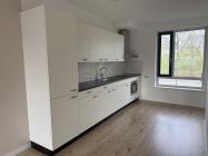 Via een vaste trap bereik je de eerste verdieping. De ruime en lichte woonkamer is voorzien van een moderne open keuken, uitgerust met een koel-vriescombinatie, vaatwasser, combimagnetron, inductiekookplaat en motorloze afzuigkap. Dankzij de vele raampartijen geniet de woonkamer van een aangename lichtinval. Vanuit de woonkamer heb je toegang tot het balkon, gelegen op het westen.