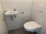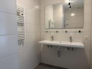 Aansluitend bereik je een tweede hal, die toegang biedt tot de tweede slaapkamer, een separaat zwevend toilet met fonteintje en de volledig betegelde badkamer. De badkamer is uitgerust met een verbrede wastafel met twee kranen, een grote spiegel, een elektrische handdoekenradiator en een comfortabele inloopdouche.