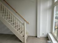 Eigen entree. Hal welke toegang geeft tot de eigen berging. Badkamer voorzien van douche, wastafel en aansluiting voor de wasmachine. Ruime woonkeuken voorzien van standaard keukenblok. Via de vaste trap in de keuken kom je op de eerste etage waar zich de woonkamer bevindt. Ruime slaapkamer met toegang tot het balkon.