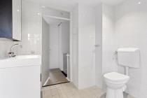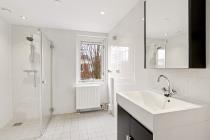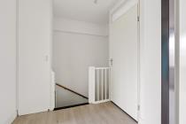 Overloop met toegang tot de drie slaapkamers van diverse afmetingen en de badkamer. De badkamer is voorzien van een douche, toilet, wastafel en wasmachine aansluiting.