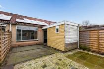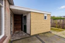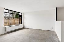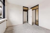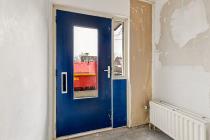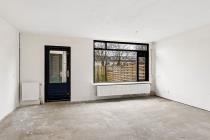 Entree/hal met meterkast, toilet en tussendeur naar de woonkamer. De woonkamer is ruim en door de grote raampartijen is er veel lichtinval. De keuken die grenst aan de woonkamer is een eenvoudig keukenblok zonder inbouwapparatuur. Deze tussenwand is gemakkelijk te verwijderen om er een open keuken van te maken. middels de tussendeur is de eerste kamer te bereiken. Dít kan als zowel slaap - als werkkamer worden gebruikt. De ruime tuin aan de achterzijde is gelegen op het zonnige zuiden. In de tuin is een vrijstaande berging aanwezig.