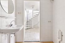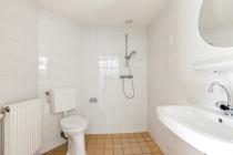 Overloop met toegang tot de drie slaapkamers van diverse afmetingen en de badkamer. De badkamer is voorzien van een douche, toilet en wastafel.