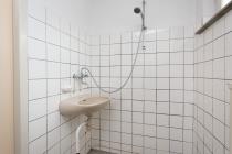 De overloop met vaste kast geeft toegang tot alle vertrekken. Er zijn drie slaapkamers: twee aan de voorzijde (waarvan één met vaste kast) en één aan de achterzijde met balkon en wastafel. De badkamer is uitgerust met een douche, wastafel, wasmachineaansluiting en een raam voor natuurlijke lichtinval en ventilatie.