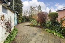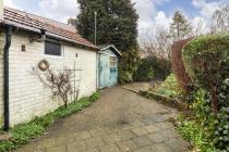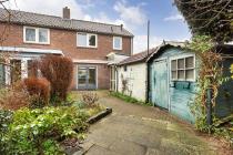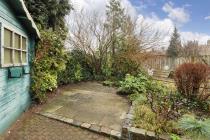 - Achtertuin op het oosten met stenen berging en blokhut.