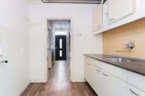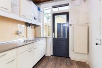 Via de entree kom je in de hal met meterkast, trapopgang, praktische trapkast en een toilet met fontein. De begane grond is afgewerkt met een laminaatvloer. De doorzonwoonkamer beslaat de volledige lengte van de woning en biedt een prettige, functionele leefruimte met volop mogelijkheden voor een comfortabele inrichting. De ruimte leent zich uitstekend voor het creëren van een gezellige zithoek rondom de aanwezige schouw, gecombineerd met een ruime eettafel waar je met gemak met meerdere personen kunt dineren. Dankzij de dubbele deuren is er een directe verbinding met de tuin, wat zorgt voor een fijne overgang tussen binnen en buiten. De woonkamer is daarnaast voorzien van een tv-aansluiting en glasvezel. De dichte keuken is eenvoudig uitgevoerd in een 4-bloks opstelling met twee bovenkasten. Vanuit de keuken is er toegang tot de bijkeuken. Vanuit de bijkeuken zijn de achtertuin en de aangebouwde stenen berging bereikbaar.