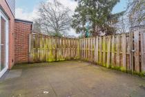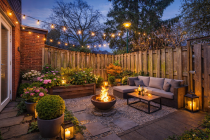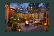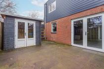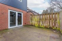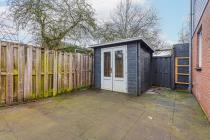 De achtertuin is gelegen op het noordoosten, bereikbaar via een achterom en volledig betegeld. In de tuin staat een vrijstaande houten berging/blokhut. Aan de achtergevel is een waterkraan aanwezig.