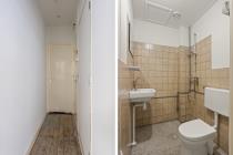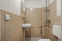 De praktische badkamer is voorzien van een douche, toilet en wastafel.