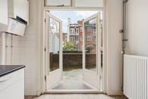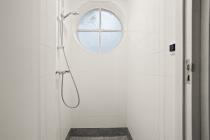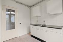 De dichte keuken is uitgerust met een eenvoudig keukenblok, aansluitingen voor de wasmachine en de cv-installatie. Dankzij de openslaande deuren loopt de keuken naadloos over in de buitenruimte. Verder beschikt het appartement over een badkamer met douche en een separaat toilet.