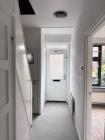 Overloop met toegang tot drie slaapkamers. De badkamer is modern uitgevoerd en voorzien van inloopdouche en wastafelmeubel.